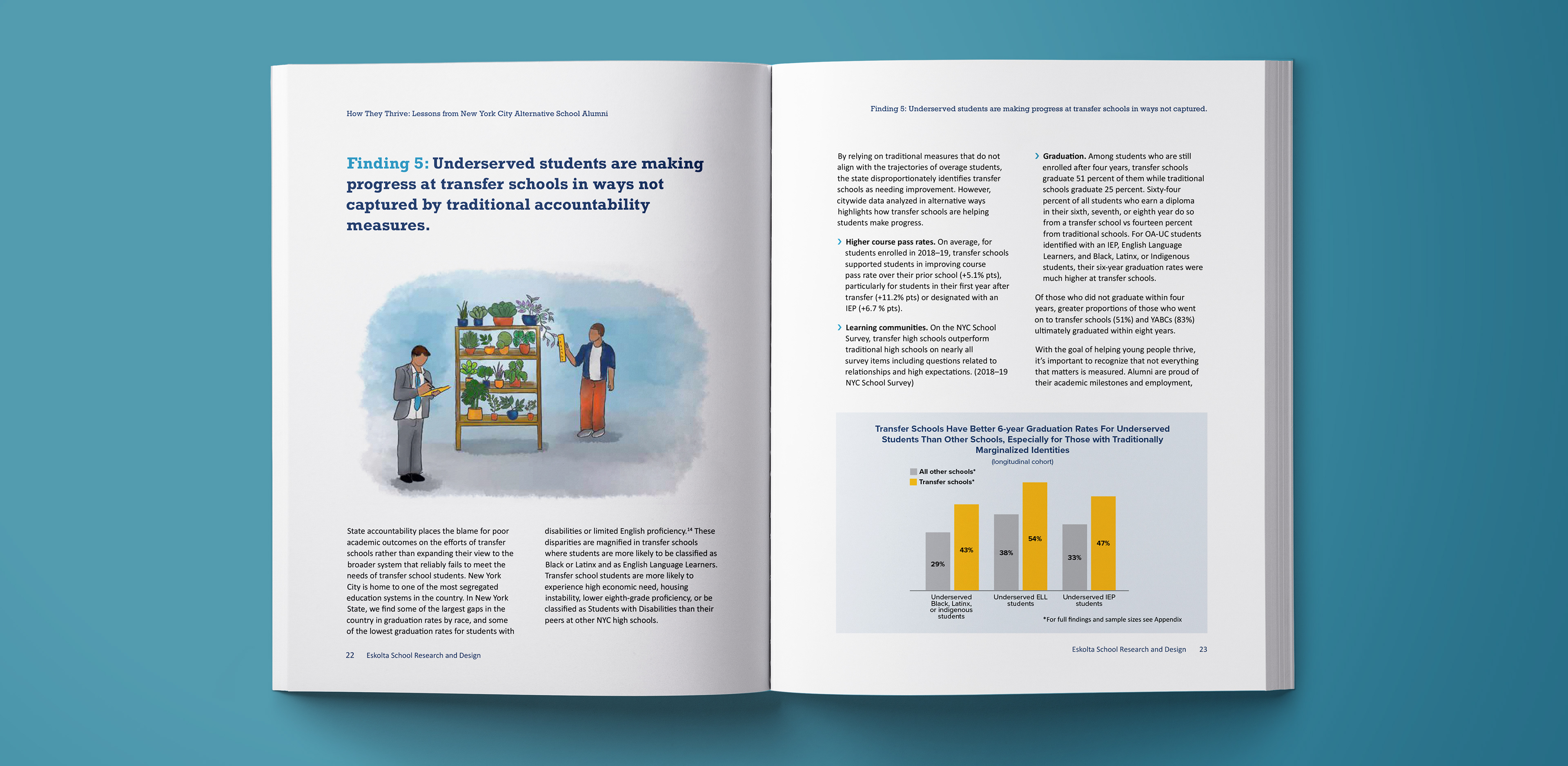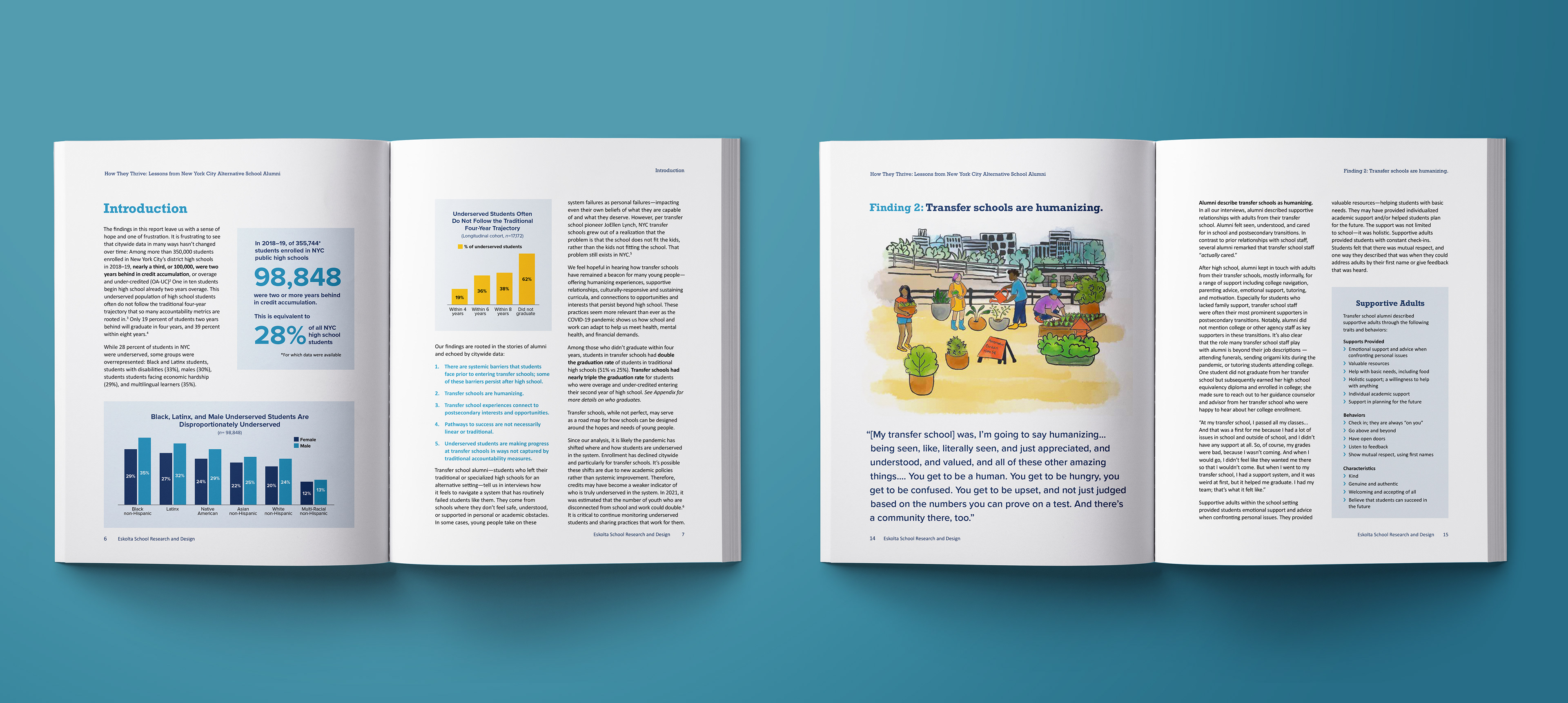 How They Thrive highlights how NYC alternative high schools support students traditionally underserved by the system, using student outcomes and alumni voices to inform policy and practice. Designed within Eskolta’s established brand system, the report needed to function across both print and digital formats and communicate effectively to policymakers and educators. I developed a cohesive visual language—including typographic hierarchy, spacious layouts, and data visualizations—that balances narrative storytelling with clear presentation of findings. I digitally colored hand-drawn illustrations by an alum artist using vivid watercolors to introduce warmth and approachability, helping counter deficit-based narratives about transfer schools. The resulting design system scales across the full report and supporting social media assets, ensuring consistency and clarity across channels.